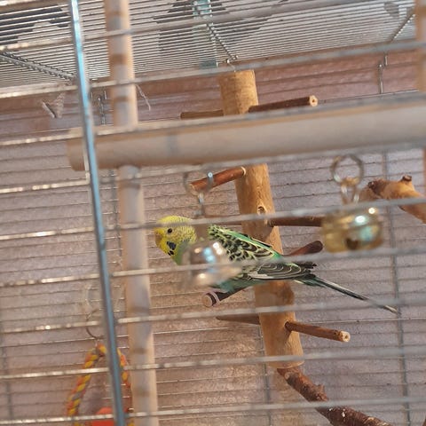 Två undulatfåglar, en hane och en hona. De är tama och tycker mycket om varandra. Båda är mindre än ett år gamla. Den gula är honan och den gröna är hanen. De gillar att leka och flyga runt i hemmet och återvänder alltid till buren efteråt. De tycker även om att bada. De är mycket fina och vänliga. Allt som tillhör dem ingår, inklusive buren och alla tillbehör. Jag vet egentligen inte hur jag kunde ta beslutet att sälja dem, men tyvärr har jag inte tillräckligt med tid för dem.