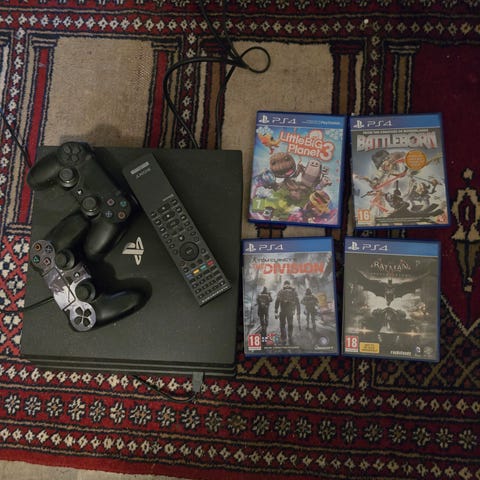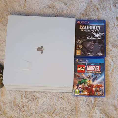 PlayStation 4 PRO, 1TB, inklusive två handkontroller med laddkablar. Ström- och HDMI-kablar ingår.