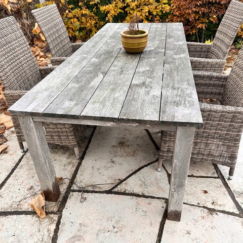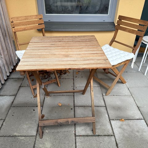 Trädgårdsbord tillverkat i trä med hopfällbar funktion för enkel förvaring och transport. Bordet är kvadratiskt och har ett robust utförande, lämpligt för utomhusbruk på balkong, altan eller trädgård.
