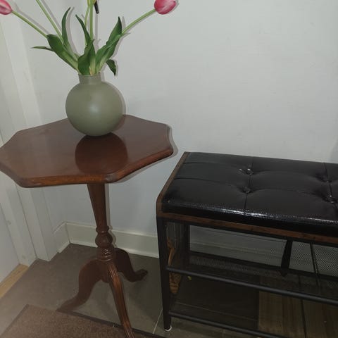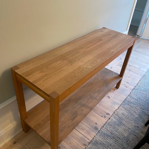 Det är otroligt oklart varför jag ens köpte detta bord för en tid sedan. Hur som helst nu är det nymålat med hammarlack på metallunderredet och linolja på skivan. Det är jättefint men jag har absolut ingenstans att ha det! Hjulen funkar okej men inte mer.