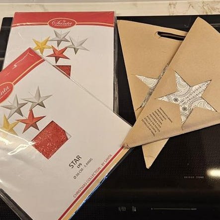Säljer 2 st nya beige adventsstjärnor i papper som ser ut som linnetyg. Mått från spets till spets 1 m. Var för stora.