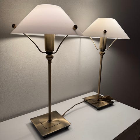 Lamporna är stabila i basen och har dekorativa skärmar med tyg och fransar i fint skick. Trevligt par för vardagsrum, läshörna eller hotellkänsla i hemmet.