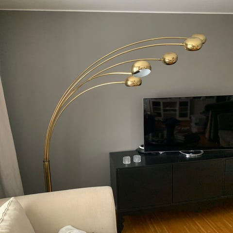 Säljer två matchande golvlampor i mässing med fransade textilskärmar — klassisk retro/vintage-stil (70/80-tal).