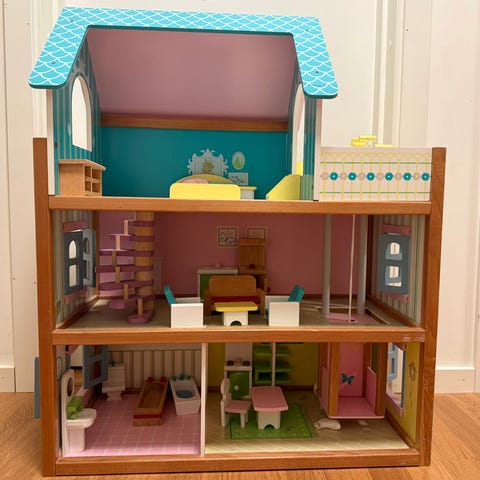 Lundby dockskåp med flera rum och detaljerad inredning. Dockskåpet har olika tapeter och golv i varje rum samt trappor mellan våningsplanen. Tillverkad i trä och plastmaterial. Passar för barnlekar och samlingar. En till dörr finns