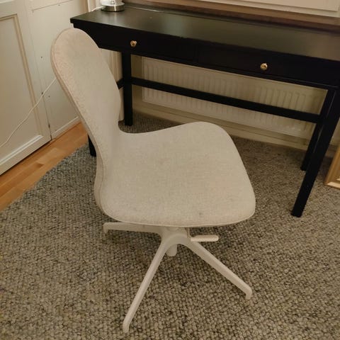 IKEA Långfjäll kontorsstol med hög rygg. Mörkgrå klädsel och svart underrede.