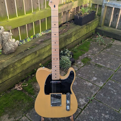 Bra, fin Squier, nya strängar, låter riktigt bra. Klistermärket går givetvis att ta bort. Några små dings men gitarren från 2001.