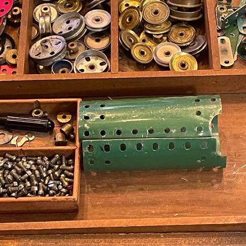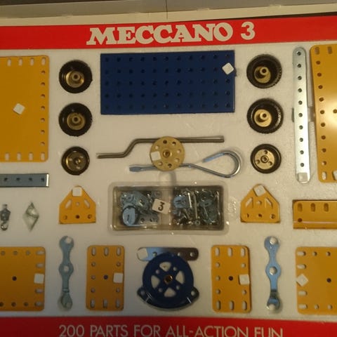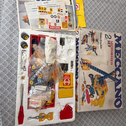 Meccano låda nr 5, levererades före 1978 då lådorna 2 - 8 ersattes med sex helt nya satser med namnen A och 1 - 5. Ej helt komplett men i original kartong och broschyrer. Kompletterar med de extra foldrarna 1,2,3,4 samt en del extra mtrl från Meccano. Finns i Umeå och kan skickas mot extra kostnad.
