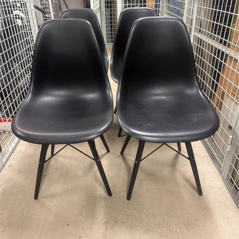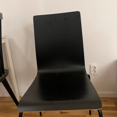 3 svarta stolar i trä. Ben av metall. Går att stapla på varandra.