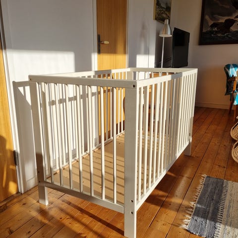 Spjälsäng Sundvik inköpt på IKEA för ca 1,5 år sedan. Går att ta av ena sidan och sänka bottnen när barnet blir större.