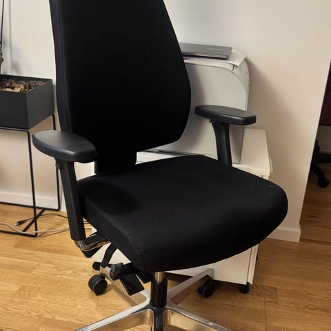 BoConcept kontorsstol i vit läder med kromade ben. Stolen har en ergonomisk design med armstöd och är avsedd för kontorsbruk. Lädermaterialet visar viss användning och mindre fläckar.