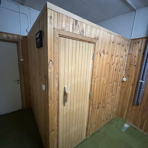 Bastu i trä med glasdörr och fönster. Inredning med träbänkar och Helo bastuaggregat. Passar för inomhusbruk och avsedd för avkoppling och bastubad.