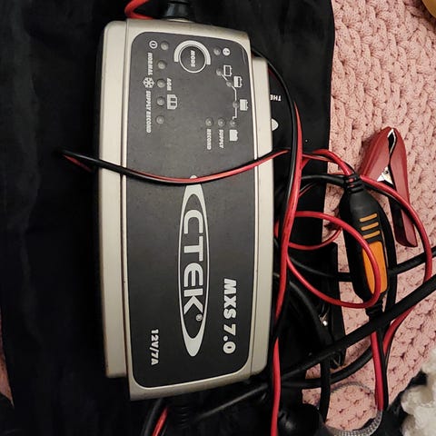 CTEK Battery Charger & Maintainer, vit och svart, utrustad med klämmor och ringkabelanslutningar. Används för laddning och underhåll av bilbatterier.