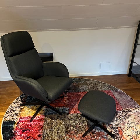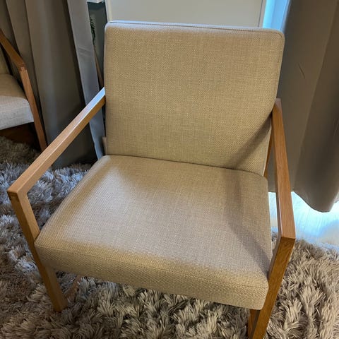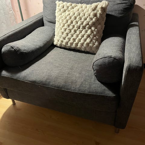 Jag säljer en grå fåtölj, ursprungligen från Jysk.