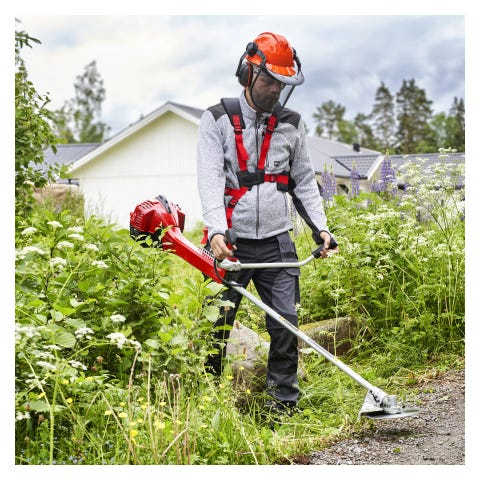 Husqvarna 345FX röjsåg med bensindriven motor. Utrustad med tvåhandsfattning och en skärskiva för effektiv röjning. Maskinen säljes i befintligt skick och behöver repareras.