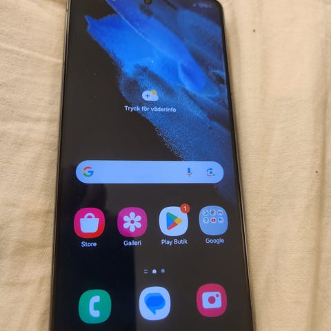 Samsung Galaxy S21 FE 5G smartphone med 128 GB lagringsutrymme. Telefonen har en svart färg och en skärm med pekfunktion. Den är utrustad med flera kameror på baksidan och kör operativsystemet Android.