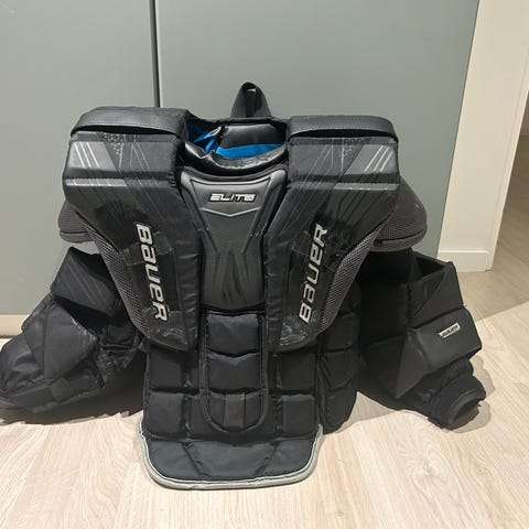 Bauer Street Hockey Målvaktsätt Junior i storlek 27, svart och vit färg. Med komplimenterande axelskydd och hjälm. Det följer även med en riktig ishockey stöt.