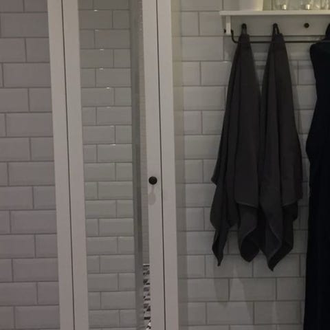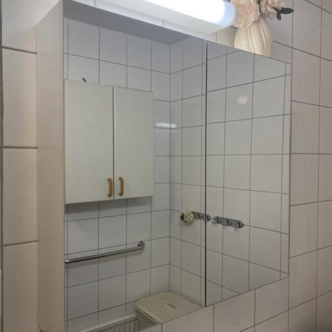 Nytt och fräscht badrumsskåp med spegeldörrar och belysning.