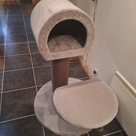 Denna klätterställning är för hög för våran lägenhet eftersom struven till näst sista delen var för lång och nu har den kommit bort. Vi har kvar alla delar till den förutom 1 skruv (som finns troligtvis att köpa) Därför har vi sänt priset på den, den är enbart 4 månader gammal, men våran katt gillar den inte jättemycket. Färg grön
