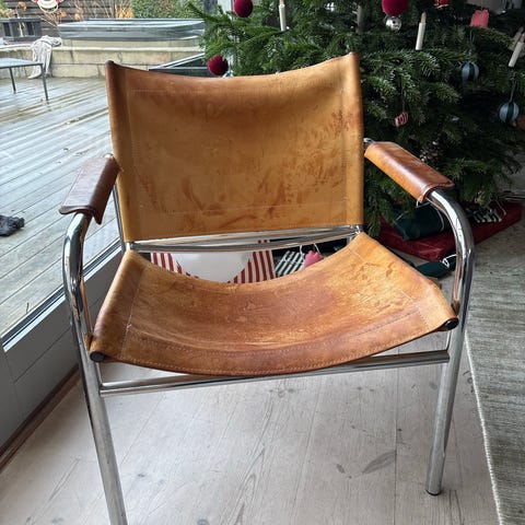 Stomme av kromad metall. Rygg, sits och armlän av brunt läder. Sitthöjd 39, bredd 68, höjd 76 cm.