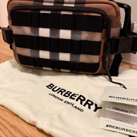 Väska Burberry Mini Pocket Bag ljusblå, i canvas och skinn 23x26x19cm, med axelrem och dustbag