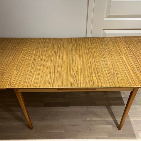 Matbord i teak. Förlängningsbart. Längd 125 cm, bredd 85 cm (med iläggsskiva 158 cm långt). Går att skruva loss benen.