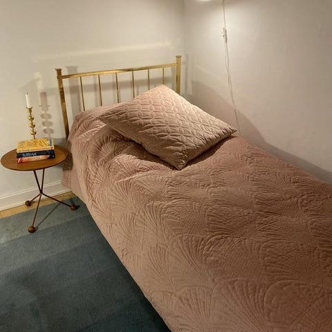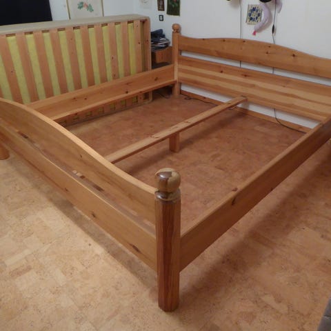 Fin sängram i trä. jag tror det är betsad furu men är osäker.