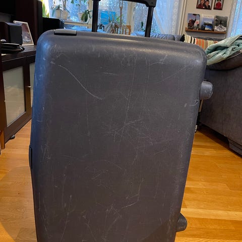 Samsonite plast resväska med hjul och utdragbart handtag. Väskan är blå och har en robust konstruktion lämplig för resor. Inredningen är enkel och rymlig för packning av personliga tillhörigheter.