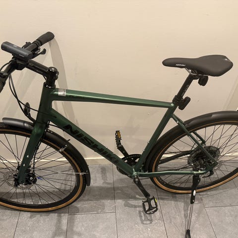 Nishiki Hybridcykel. En cykel av hybridtyp som kombinerar egenskaper från både landsvägs- och mountainbikes för mångsidig användning.