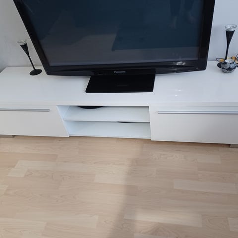 Säljer en stilren vit TV-bänk i högglans med glasskiva i mitten och praktisk förvaring med lådor på sidorna. Använd men i fint skick, inga kända skador.
