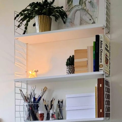 Den högra gaveln på bilden har en pinne som gått av och samt två pinnar som har lossnat på en sida. Går att limma så att det inte syns och beroende på vart man vill placera hyllorna är det inget som stör funktionen.