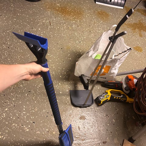 Snöborste med blå och svart färg, utrustad med teleskopskaft för justerbar längd. Har en isskrapa med flera skrapkanter för effektiv borttagning av is från fordon. Passar för vinterbruk på bilar och andra fordon.