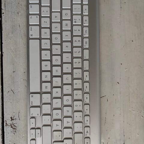Apple trådlöst tangentbord med vit och silver färg. Designat för att användas med Apple-enheter och erbjuder trådlös anslutning. Tangentbordet har en kompakt och stilren design med låga tangenter och aluminiumram. One key is missing. Other than that, it works fine.