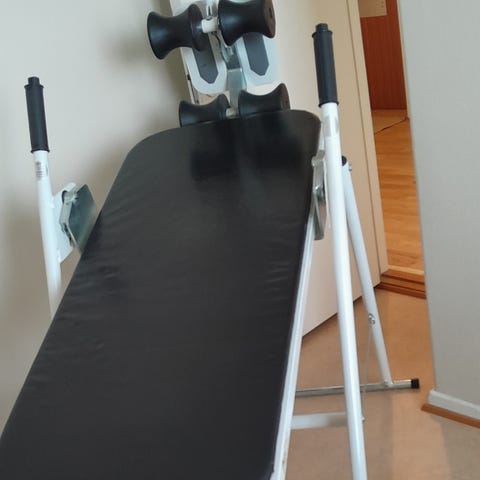 Mastercare, Svenska Hälsobänken Inversionsbänk med röd dyna och metallram. Används för inversionsterapi som innebär att sträcka ut ryggraden, minska trycket på diskar och nerver och förbättra blodflödet till hjärnan och andra delar av kroppen och stretching. Justerbar mellan 150-210 längd, Ryggdynan har en lite skada i hörnet enligt bild.