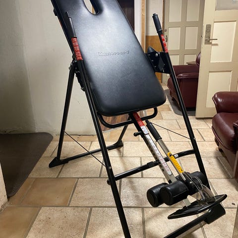 Mastercare, Svenska Hälsobänken Inversionsbänk med röd dyna och metallram. Används för inversionsterapi och stretching. Justerbar mellan 150-210 längd, Ryggdynan har en lite skada i hörnet enligt bild.