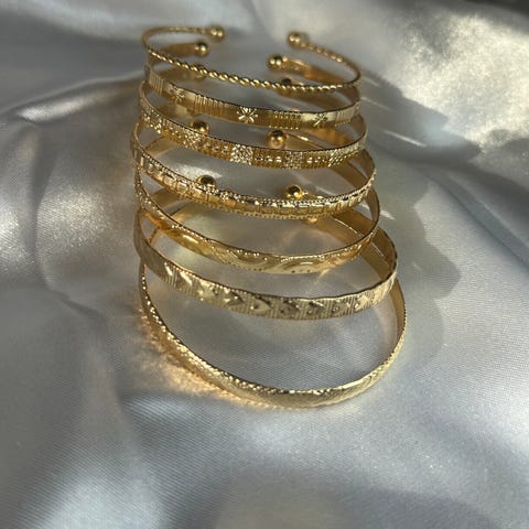 Den breda, trediga armbandet är utrustat med ett gångjärn och ett spärrspänne för öppning.