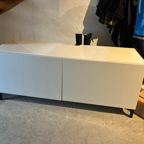 tv-bänkmed vit yta och förvaringslådor i underdelen. Bordsskivan har en glasskiva som täcker en del av bordet. Mått 0.50 cm höjd, 120cm lång, 0.47 cm bredd