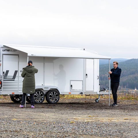 Nu kan vi erbjuda en riktigt vass specialbyggd Umesläp Edge 650. Isolerad, lättdragen och aerodynamisk trailer i aluminium/sandwich/rostfritt för lång livslängd och låg vikt. Vagnen väger ca 1200 kg med utrustning enligt bilderna. Den strömlinjeformade formen minskar luftmotståndet och gör den snål att dra – extra fördel för elbilar.