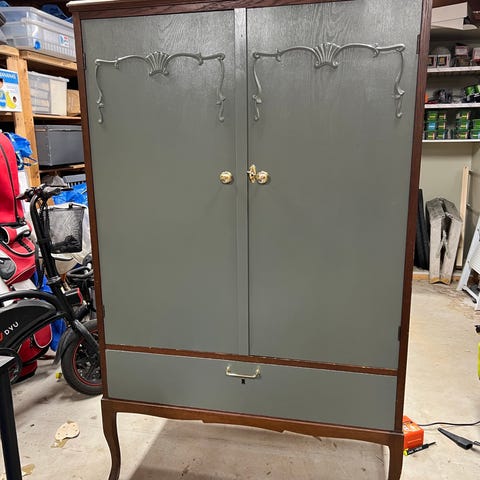 Ett charmigt stabilt,snyggt skåp på ben, i ren trä med fane'r på.Målat av tidigare ägare.Målas om eller ha det som det bara är.