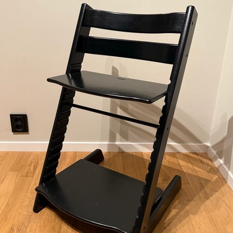 Stokke barnstol i brunt trä med svart bricka och grå dyna. Barnstolen är designad för barn och erbjuder en stabil sittplats med justerbar bricka för måltider och lek. Passar för användning vid matbord eller som en separat barnstol.