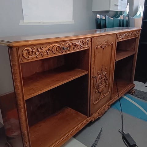 Klassisk sideboard / skänk med vackra utsmyckningar, handmålad i antikgrått. Passar lika bra som tv-möbel som matsalsmöbel / i sovrummet. Insida med hyllplan samt låda. Nyckel till ena låset, andra dörren stängs med magnetlås.