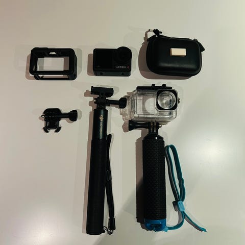 DJI Osmo Action 3 actionkamera med kompakt design. Kameran är svart och levereras med originalförpackning, laddare och förvaringsväska. Passar för användning vid olika aktiviteter och inspelningssituationer.