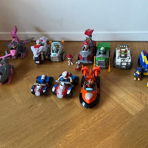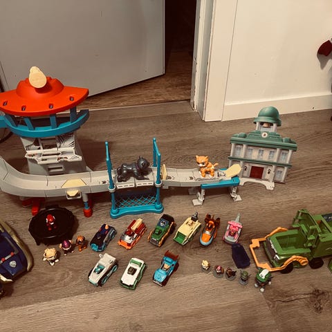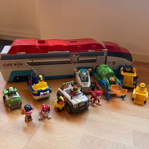 Paw Patrol lekset med flygplan, ramp och flera fordon. Samt den stora transport bussen. Setet inkluderar flygplansmodell med öppningsbar lucka, som dock är trasig men kan hållas uppe med en bit tejp. Finns högtalare på tornet, samt flygplanet som oklart om de fungerar men dessa behöver troligen nytt batteri. Fins ramp med rutschkana och olika små fordon kopplade till serien. Leksakerna är huvudsakligen i färgerna rött, blått och vitt och är avsedda för barn.