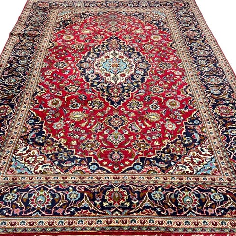Rejäl och mycket dekorativ handknuten Bakhtiar-matta i storlek ca 320 × 212 cm. Klassisk Bakhtiar-karaktär med kraftfull medaljong, djupa röda och mörkblå toner samt tydlig bård med traditionella ornament. En matta som ger värme och tyngd i rummet och passar perfekt i större vardagsrum, matsal eller öppen planlösning.