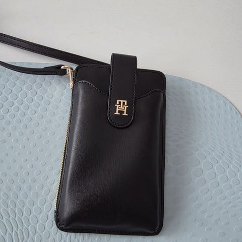 Tommy Hilfiger tygväska för unisex i marinblå färg med röda ränder. Väskan har bruna handtag och en rymlig insida med flera fack. Materialet är tyg och väskan är lämplig för vardagsbruk.