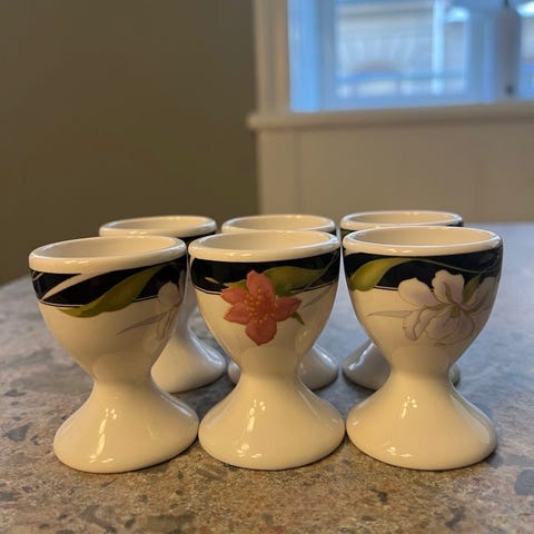 Fyra äggkoppar som ser ut som små Margretheskålar.
