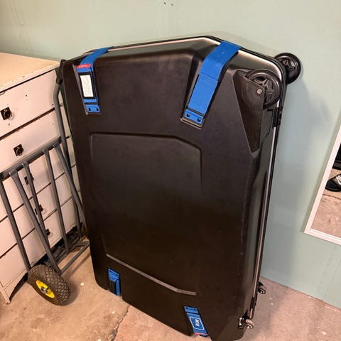 Väska i hårdplast, med 4 hjul. Passar utmärkt för flygtransport av cykeln. Styret behöver inte tas av bara vridas. Hjulen får plats i väskan.
