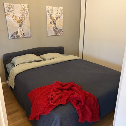Sängen har stått i en pendlarlägenhet och har alltid används med ett madrasskydd. Katt finns i hemmet.