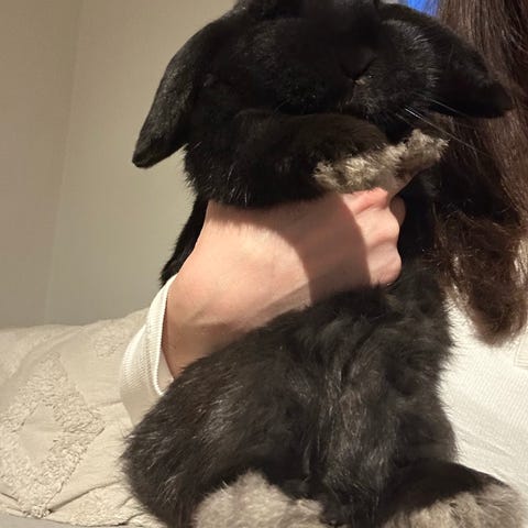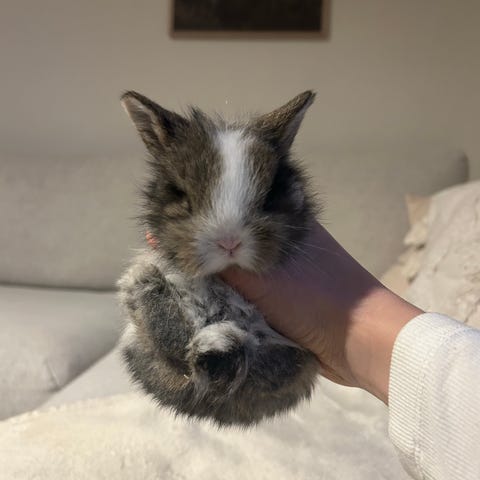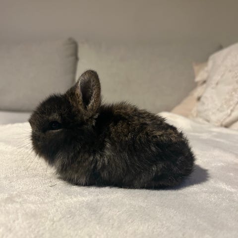 En otroligt mysig och snäll kanin som är van vid all hantering. Hen är lite mer nyfiken och busig än sina syskon och ska undersöka allt! Gör många glädjeskutt.