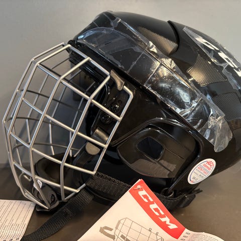 CCM ishockeyhjälm i röd färg med metallgaller. Hjälmen är avsedd för ishockey och har justerbara remmar för säker passform. Skyddar huvudet och ansiktet vid ishockeyspel. Dessutom kan man ta bort gallret om man vill