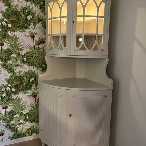 Hörnskåp i vitt trä med fyra dörrar och flera hyllplan för förvaring. Skåpet är utformat för att passa i ett hörn och erbjuder både stängda och öppna hyllor för olika förvaringsbehov.